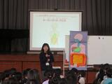分かりやすい模型やスライドを使って、胃や腸の様子、うんちの正体、そして、「早寝・早起き・朝ご飯・朝トイレ」が健康を保つ上でとても重要であることを教えてくださいました。