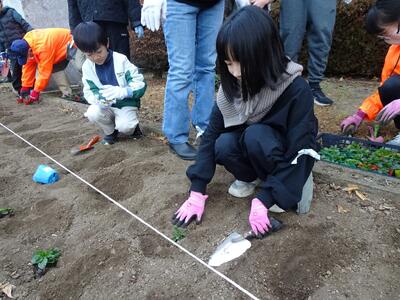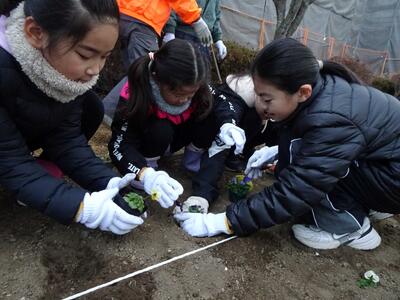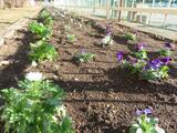 学校で種から育てたビオラやノースポールの苗を、本校の用務員が整地した花壇に植えました。