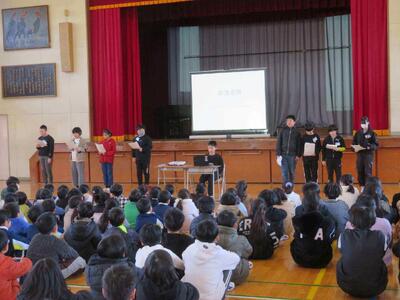 1月14日(水)朝の集会で、給食保健委員会が中心となって給食集会を実施しました。