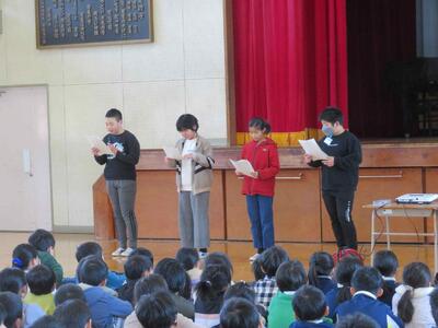 また、1年生と3年生の代表児童による作文発表では、これまでの振り返りとこれからの抱負などが発表されました。これらの講話や発表をとおして全校児童が安全で充実した冬休みを過ごし、1月7日(水)に元気に登校することを確認しました。