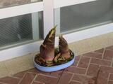 次の写真は、子どもたちに旬の食べ物を知ってもらおうと、用務員が昇降口に飾ったタケノコです。