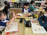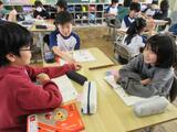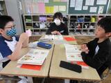 思ったとおりの話題を話してくれたり、上手くいかなかったりしながら学習を進めていました。質問できた数だけ、教科書にシールを貼っていきました。会話の練習にもなり、グループの友達と仲を深めていました。